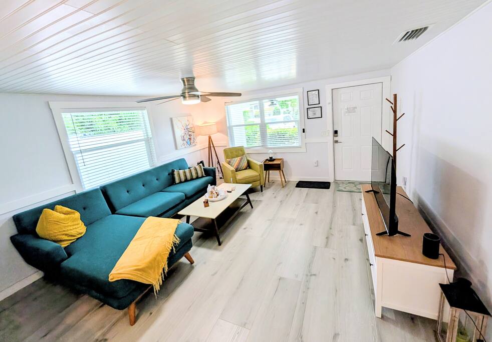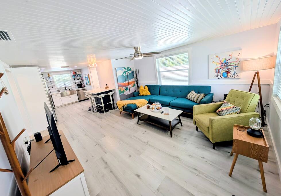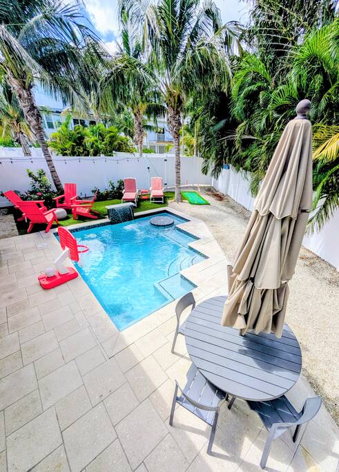 Completed remodeled boutique home with a private heated pool and waterfall, putting green, and lush tropical landscaping. This home is half of a twin duplex, each boasting its private pool, ample parking, and enclosed exterior areas. We keep our homes impeccable and you will have absolute privacy from the sister unit "Salty Harbor"